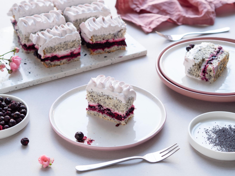 Wilgotne, mięciutkie, z porządną porcją przyjemnie chrupiącego maku. Przełożone kwaskowatą frużeliną z czarnej porzeczki i lekkim kremem śmietankowo-porzeczkowym. W tej prostocie tkwi metoda!