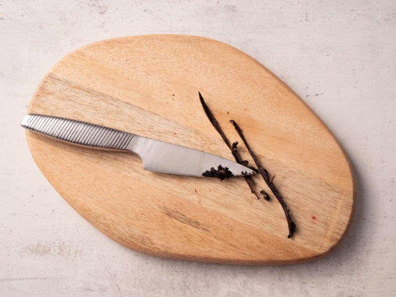 Kiedy mleko już wystygnie, rozetnij laskę wanilii wzdłuż i wybierz ziarenka.