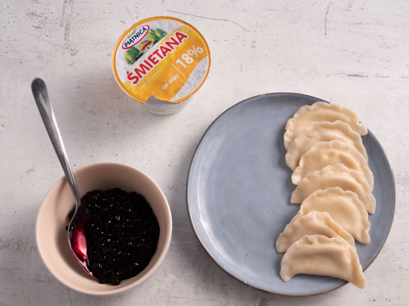 Ugotowane pierogi podawaj z kwaśną śmietaną i frużeliną z jagód.