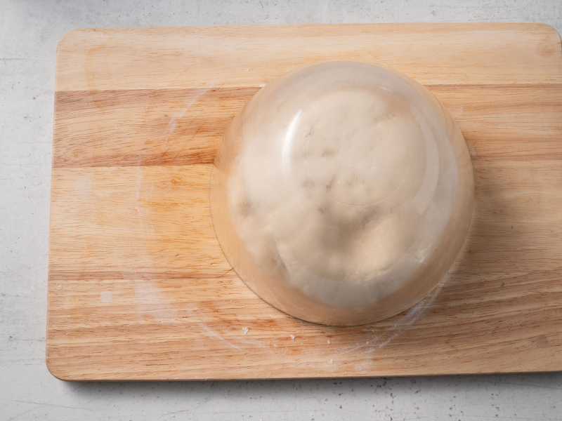 Drewnianą deskę delikatnie namocz wodą. Wyłóż kulę ciasta, przykryj szczelnie szklaną miską. Ciasto powinno odpoczywać około 20-30 minut, dzięki czemu stanie się miękkie i łatwiej będzie się z nim pracować.