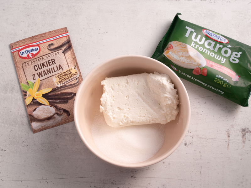 W miseczce wymieszaj twaróg z cukrem i cukrem z wanilią.