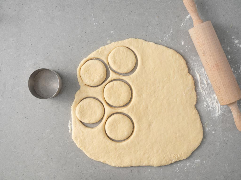 Następnie rozwałkuj ciasto na około 1,5 cm i wykrawaj kółka.