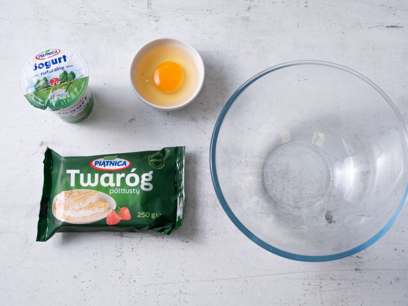 W osobnej misce wymieszaj twaróg z jajkiem i jogurtem naturalnym. Użyłam mielony twaróg, który jest dość gładki.