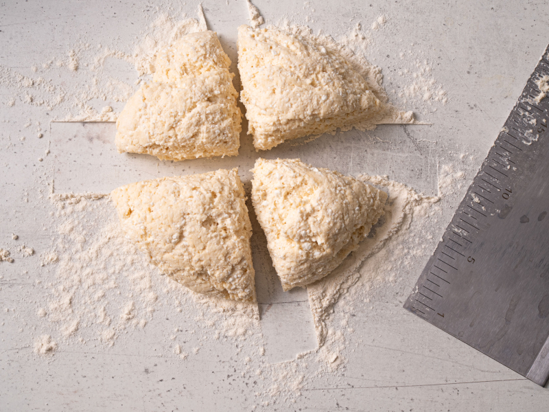 Blat podsyp delikatnie mąką. Ciasto podziel na 4 równe części.