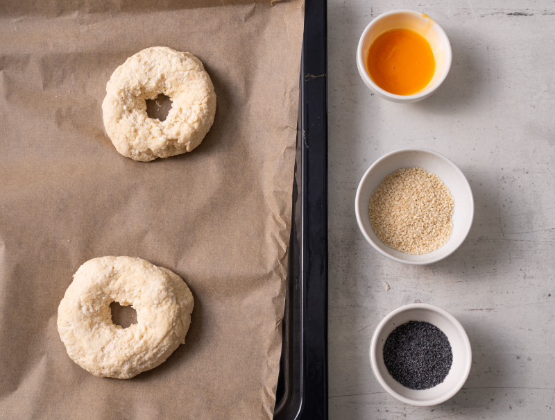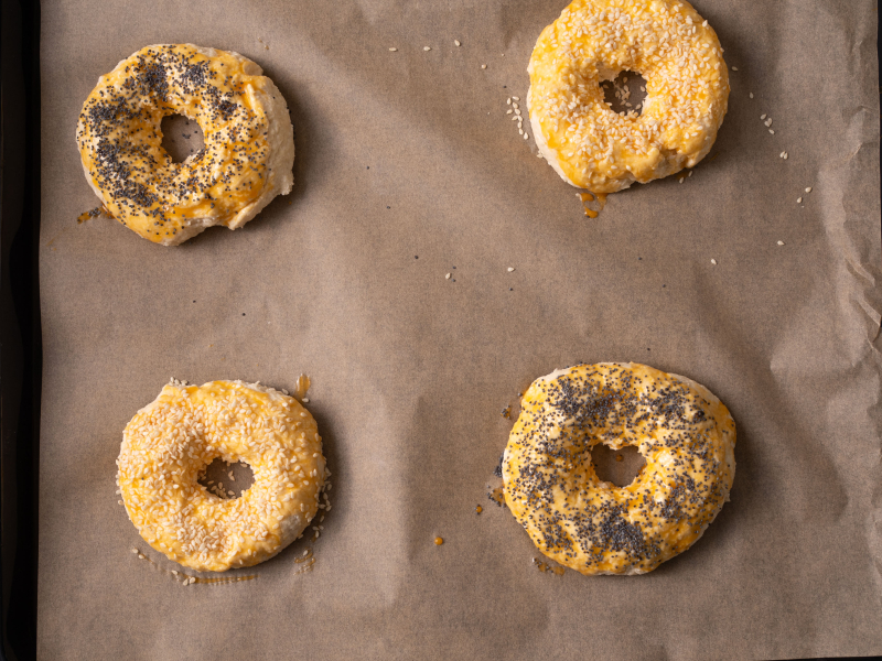 Bajgle przed pieczeniem posmaruj żółtkiem, na wierzchu posyp ziarnami sezamu i makiem.