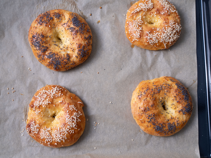 Bajgle piecz w piekarniku nagrzanym do 180°C (tryb góra-dół) przez 25 minut. Po tym czasie zwiększ temperaturę do 200°C i piecz kolejne 10 minut, do zarumienienia.