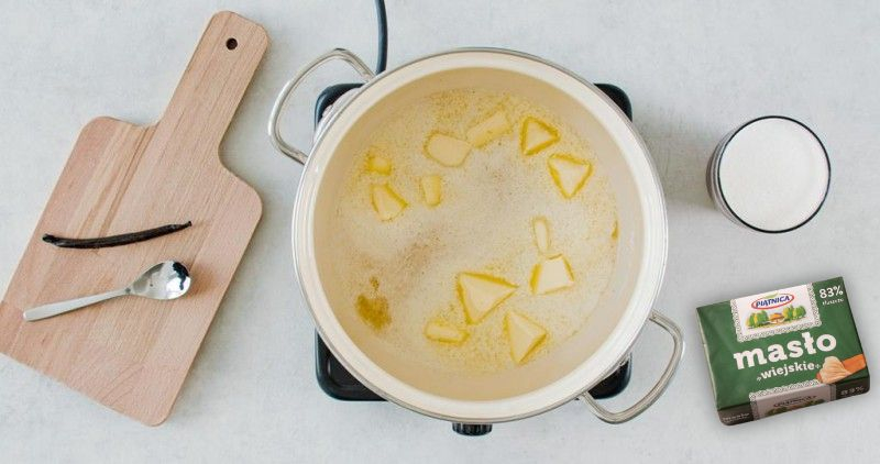 W dużym garnku na średniej mocy palnika rozpuść masło. Dodaj cukier i ziarenka z rozciętej wzdłuż laski wanilii i wymieszaj.