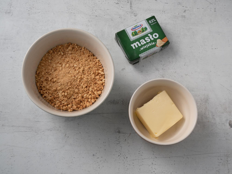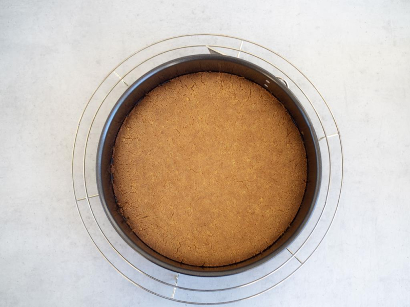 Wyłóż na spód tortownicy i wyrównaj. Wstaw do piekarnika rozgrzanego do 180°C i piecz około 10 minut do uzyskania złotego koloru. Odstaw do wystudzenia.