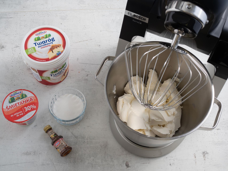 Twaróg przełóż do miski z cukrem i śmietanką, zmiksuj z ekstraktem waniliowym, tylko do połączenia składników.