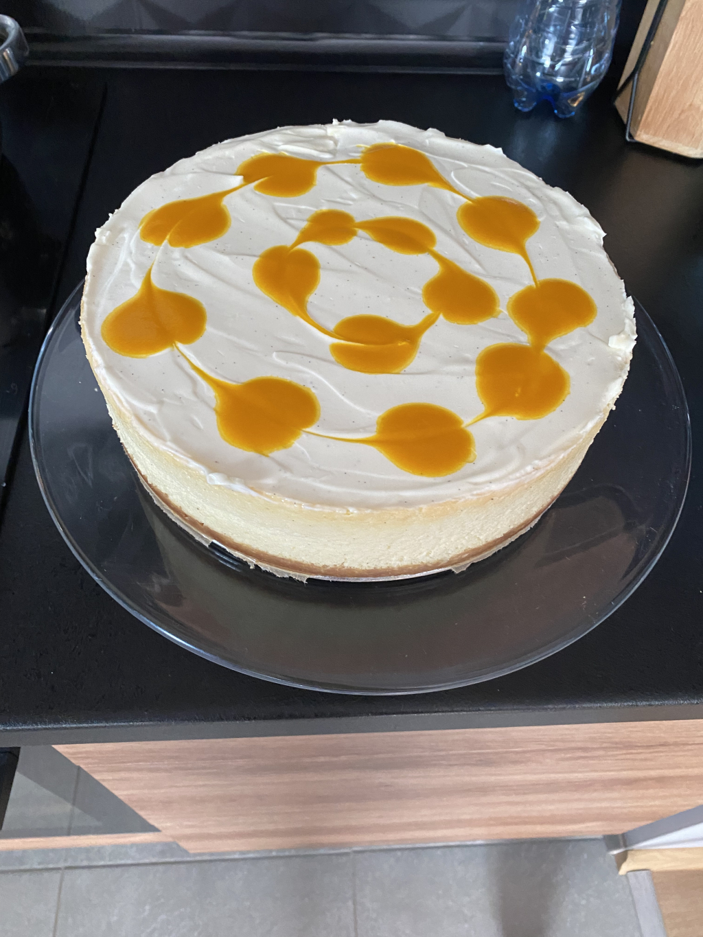 Wyłóż polewę na wystudzony sernik. Puree z marakui wymieszaj z pulpą z mango.