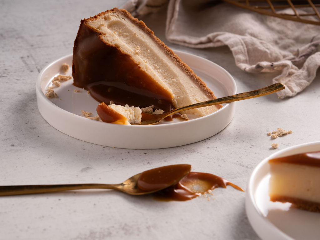 Sernik na bazie kremowych serków śmietankowych, delikatnie waniliowy, gładki i otulający. Ale jego prawdziwa osobowość ujawnia się dopiero na wierzchu. Karmel z dodatkiem pasty miso i tahini wnosi do niego coś więcej niż słodycz – pojawia się tu wyraźna, umamiczna głębia, subtelna słoność i lekko orzechowy finisz.