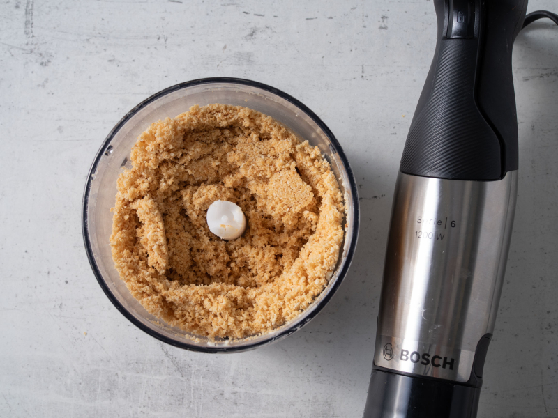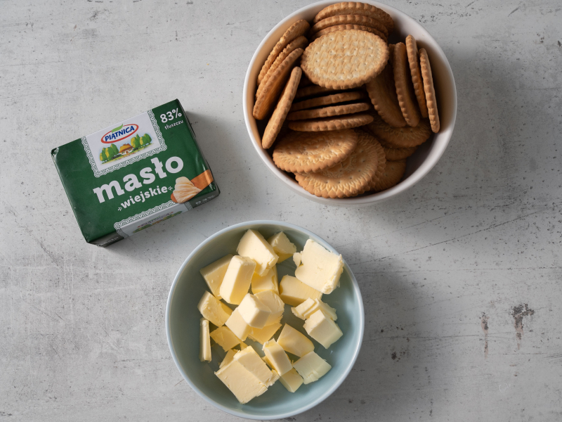 Umieść herbatniki i miękkie masło w malakserze i zmiksuj na piasek.