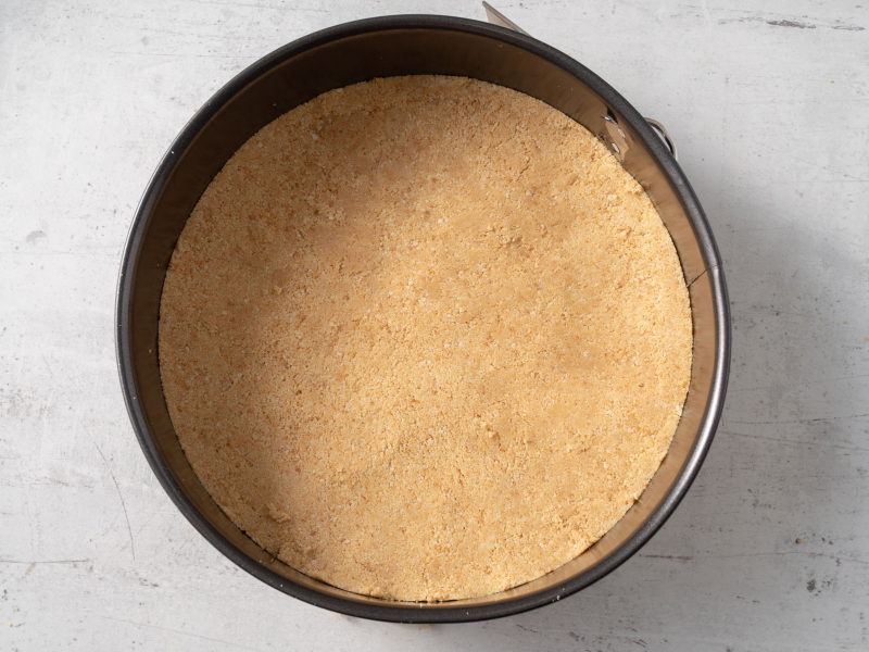 Spód tortownicy o średnicy 24 cm wyłóż papierem do pieczenia. Wysyp pokruszone ciasteczka, wyrównać i dociśnij.
