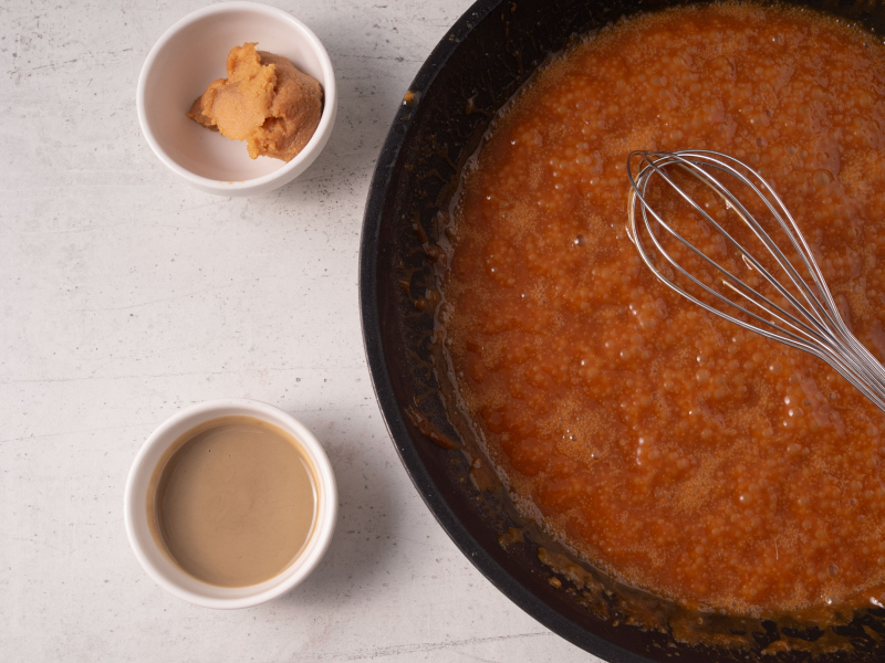 Kiedy karmel będzie już gotowy, wmieszaj pastę miso i tahini.