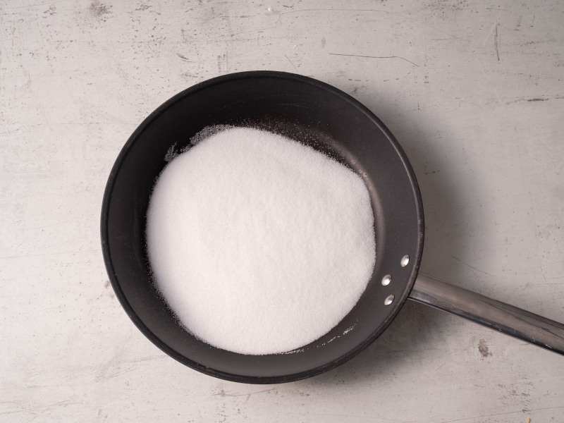 Na patelnię z grubym dnem wsyp cukier. Podgrzewaj na średniej mocy palnika, nie mieszajac (możesz delikatnie poruszać patelnią, żeby cukier równomiernie się karmelizował).