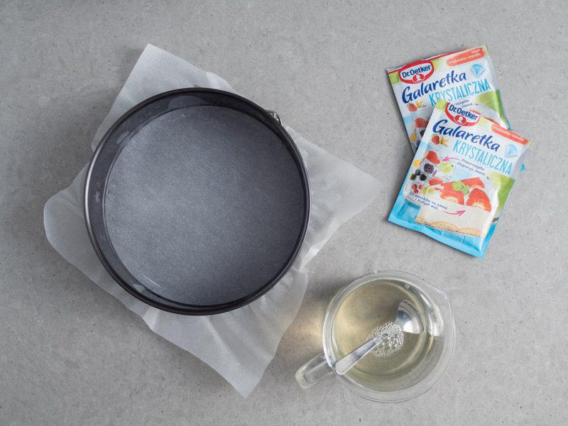 Dno tortownicy o srednicy 24 cm wyłóż papierem do pieczenia. Galaretki rozpuść w 350 ml wrzącej wody. Odstaw do wystudzenia.