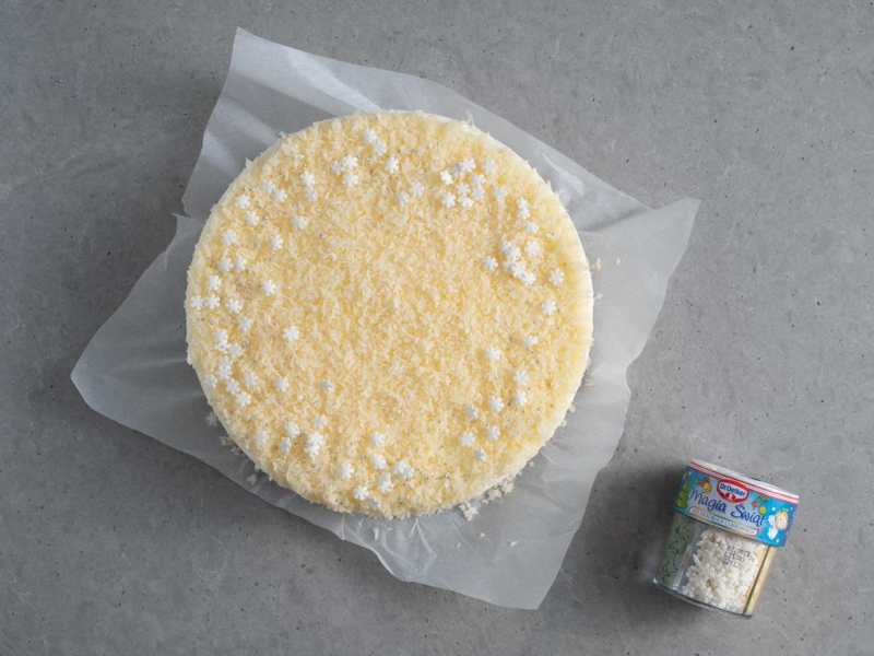 Kruszonkę przełóż na ciasto, udekoruj posypką.