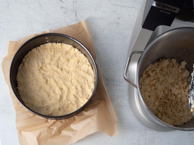 2/3 porcji ciasta wyłóż na dno formy, wyklej nim spód.