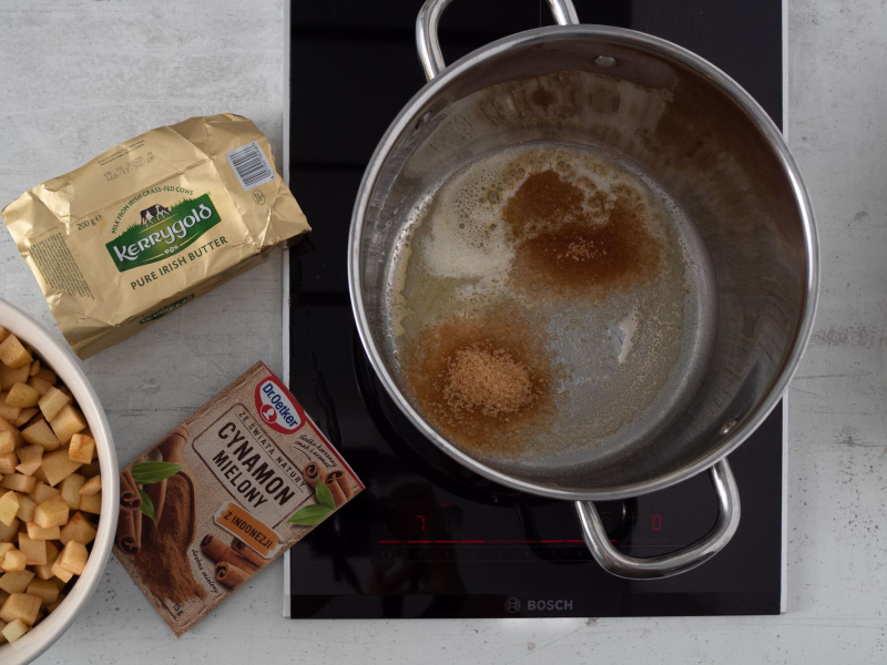W garnku skarmelizuj masło z cukrem, cynamonem i przyprawami.