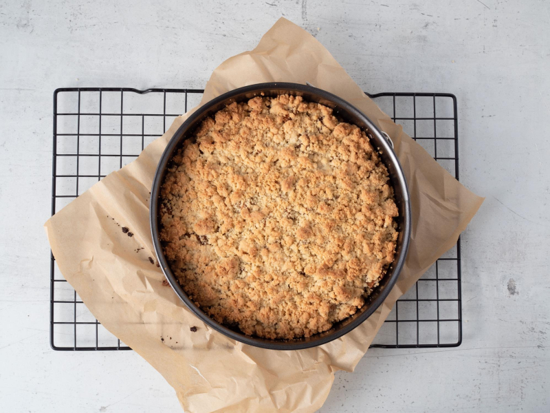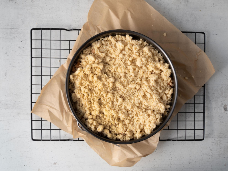 Szarlotkę z kruszonką wstaw ponownie do piekarnika na 40 minut i piecz do uzyskania złotego koloru.