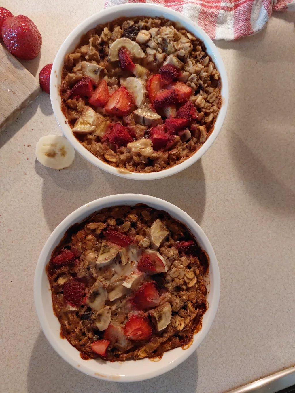 Owsianka pieczona w piekarniku smakuje jak najlepsze ciasto, a jej przygotowanie zajmuje zaledwie kilka chwil. Dorzuć ulubione owoce, orzechy i gorzką czekoladę, a zastrzyk energii na cały dzień gwarantowany! Możesz podwoić proporcje i przygotować ją w większym naczyniu dla całej rodziny 👨👩👧👦lub zjeść resztę na kolację – pieczona owsianka jest pyszna również na zimno.😋